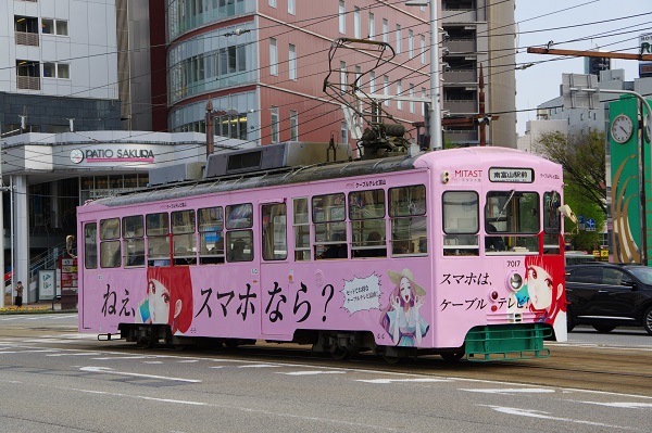 富山地方鉄道の市内電車で運行中の電車デ7017に、「ケーブルテレビ富山」の企業広告のラッピングを施し、先月の2025年3月より運行を始めている。