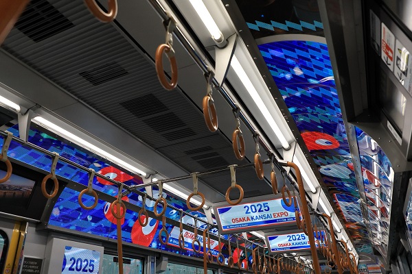 323系の1号車にのみ、車体のラッピングと、車内の広告エリアをLEDパネルにし、ミャクミャクや大阪をモチーフにしたデザインのアニメーションや、外の景色をリアルタイムに映し出す。万博アクセスルートをパビリオンのように楽しめる車両だ。