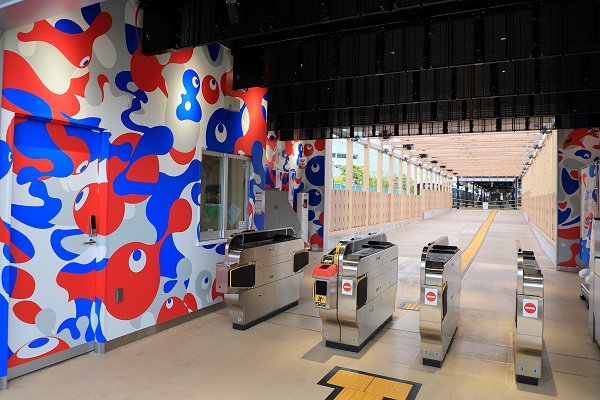 また、桜島駅は、駅の万博会場へのシャトルバス乗り場側に臨時改札を設けてあり、改札前は赤・青・白の万博のデザインが施されている。