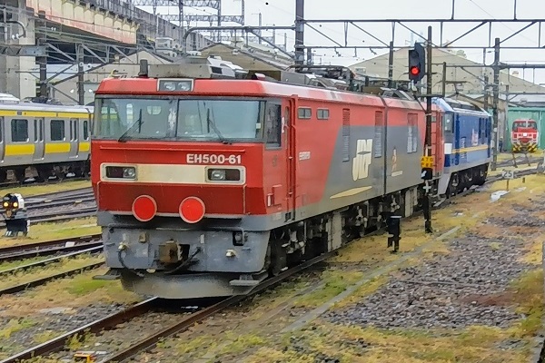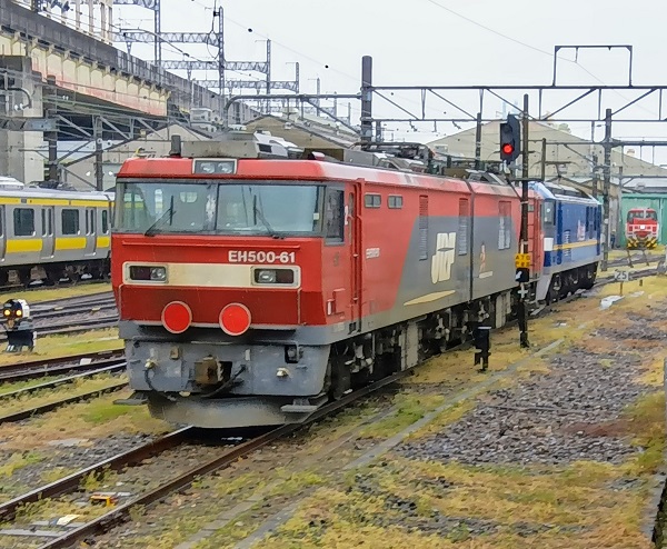 奈良仁一郎EF210-346の牽引で、無動力回送されたEH500-61。‘25.4.23 東北本線 大宮(2点共) 2025年4月23日、仙台総合鉄道部所属のEH500-61が検査のため、無動力回送となり大宮車両所へ入場した。なお、牽引は新鶴見機関区所属のEF210-346で、新鶴見信号場~西浦和~大宮間という経路で運転した。■関連記事◆安中貨物に金太トップことEH500-1が登板P:藤倉顕治