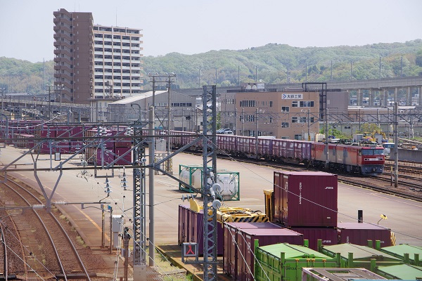 2025年4月27日、金沢貨物ターミナルの構内に、仙台総合鉄道部所属のEH500-23とコキ車20両による列車が現れた。