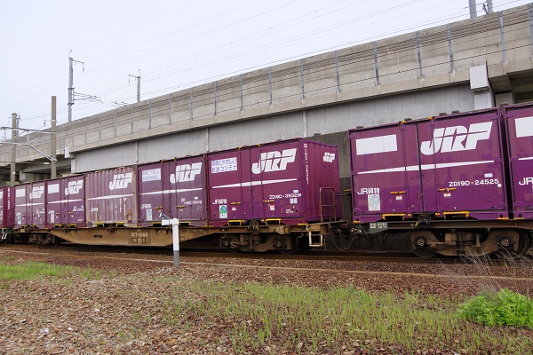 コキ車に積載のコンテナには、ZD19DやZD19F、ZD19C、ZD19Gが見て取れ、全て死重コンテナとみられる。