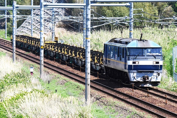 桑原 誠EF210-168+チキ9両(岩切行き)+チキ9+3両(西浜松行き)の計チキ21両。‘25.4.28 東海道本線 熱田~笠寺 2025年4月21日、黒崎発でチキ21両のレール輸送列車が運転。150mレールチキ9両(岩切行き)、150mレール9両+50mレールチキ3両(西浜松行き)を、吹田機関区の原色EF210-168が牽引した。■関連記事◆九州(黒崎)~北海道(長万部)までロングレールを延べ11日間かけて輸送P:大谷真弘