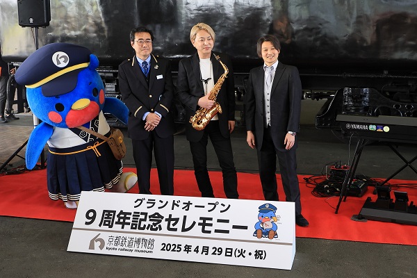 京都鉄道博物館は、2025年4月29日で開館9周年を迎え、扇形車庫内で記念セレモニーが開催された。ウメテツも参加し、前田館長の挨拶と、開館時から周年イベント時に演奏しているインストゥルメンタルユニット「大瀬戸千嶋」が京都鉄道博物館をイメージしてつくった「軌条の彼方」の演奏が行われた。