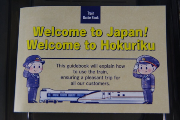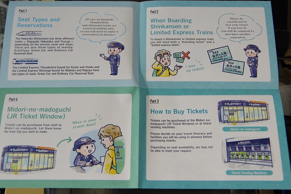 JR西日本が製作したものとみられ、内容は英語による記述で、当方英語は無知で申し訳ないが、おそらく北陸新幹線と在来線特急の概説や、利用に必要な切符、切符の購入場所(みどりの窓口・みどりの券売機)、自動改札機や敦賀駅での新幹線と在来線特急の乗り換え方法、さらに乗車のマナーなどまで幅広く網羅している。