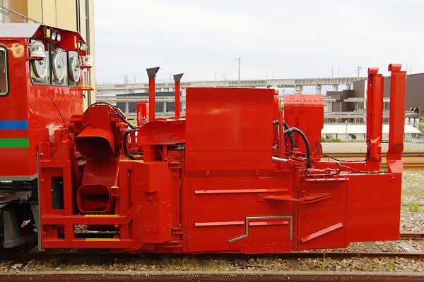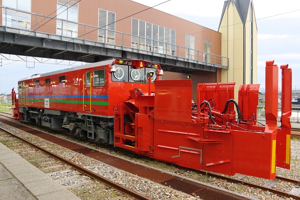個人的な体験で申し訳ないが、取材で高岡と直江津へ電車に乗り移動中、あいの風とやま鉄道で2021年春に導入された「投排雪保守用車」ENR-1000形の初号車(赤、車両番号は35番)の姿を見つけ、帰りに初めて実車の全景の撮影と観察が、導入から4年越しで叶った。