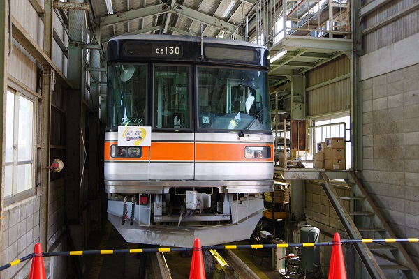 建屋内に展示された新型03系の03-130+03-830編成。「石川線開業110周年・浅野川線開業100周年」記念のロゴマークを掲出していた。