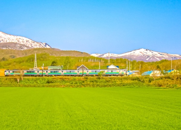 残雪残るニセコ山系と新緑とキハ201系気動車。