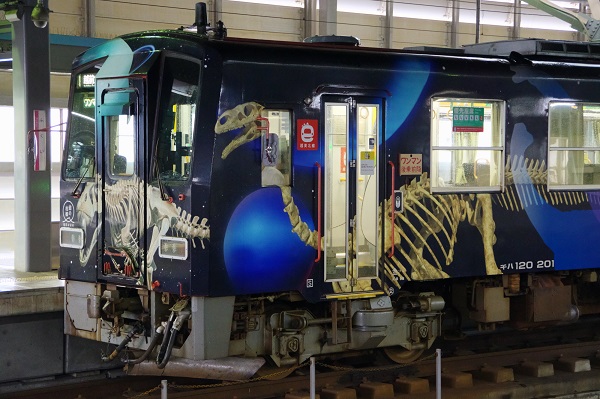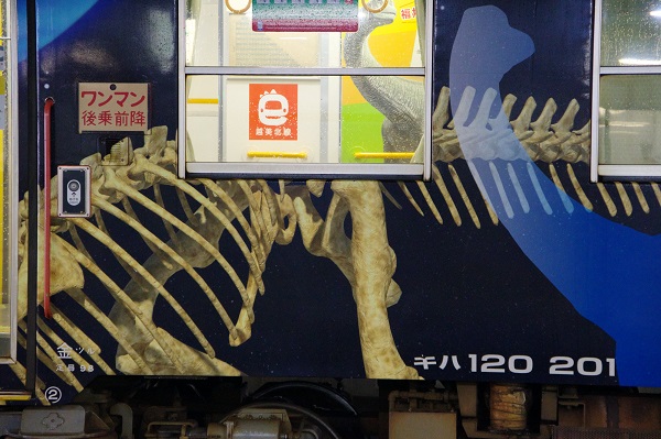 外装に掲出しているのは一部の車両で、キハ120 201(ディノスター号)、キハ120 203、キハ120 204(戦国列車)だ。一方、内装の装飾はキハ120 202(一乗谷 DISCIVERY PROJECT復刻)も含む全車5両で実施している。