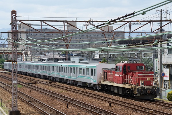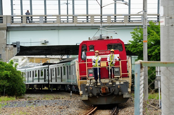 DD200-15に牽引され川崎車両を出発する9000系増結用車両。