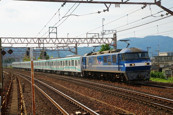 EF210-136の牽引で琵琶湖線を行く甲種輸送列車。