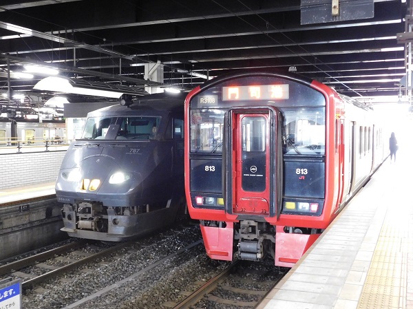 始発駅の小倉駅では、門司港行き526Ⅿの813系RⅯ3108編成と並んだ。