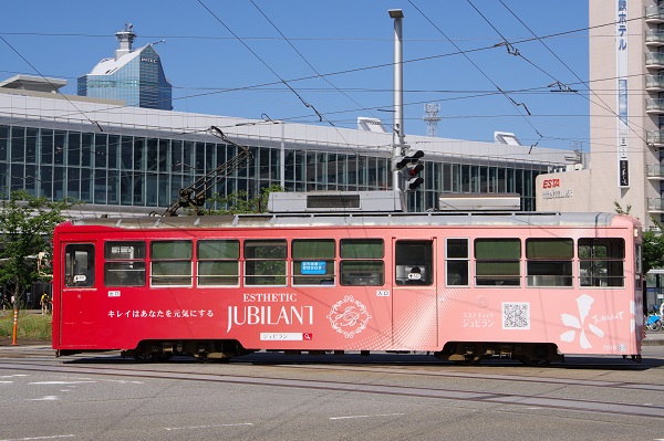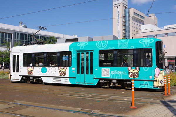 ◆富山地方鉄道の市内電車でケーブルテレビ富山のラッピング電車「モモ電」運行中