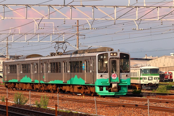 そんな中、車輪転削で長野総合車両センターを訪れたえちごトキめき鉄道「開業10周年」ヘッドマーク付きET127 V9編成とC1編成が顔を合わせ、まるで、えちごトキめき鉄道を代表して「お疲れ様でした」と挨拶しているような夕刻の光景を目撃した。