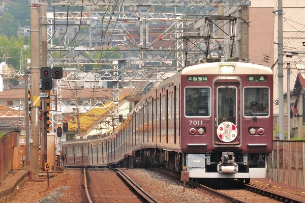 阪急電車の宝塚線、神戸線、京都線では、2025年度の「祇園祭」「天神祭」のヘッドマークを取り付けて運用されている編成がある。デザインは今年度から刷新されている。宝塚線では7011編成に「祇園祭」、8006編成に「天神祭」のヘッドマークを、7月1日から取り付けている。〔乾 英雄〕
