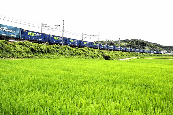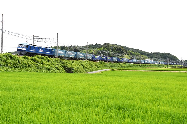 2025年7月12日、盛岡貨物ターミナル発笠寺行きの「トヨタロングパスエクスプレス」8067列車は、新鶴見~笠寺間を、7月10日に広島車両所で全般検査が施されルーバー部も含め白帯が入り、スカートがタークグレーに新塗装されたEF210-145が牽引した。積載コンテナも39個中23個がNIPPON EXPRESSの新デザインコンテナを積載しての輸送となった。