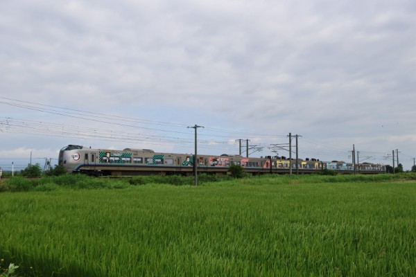 池端清美789系1000番代5両編成「鬼滅の刃」号。‘25.7.14 函館本線 江別~豊幌「鬼滅の刃」ラッピングの特急「カムイ」、好評運転中!‘25.7.29 函館本線 茶志内〜美唄 P:佐藤直幸 2025年7月14日から函館本線で789系カムイ編成の「鬼滅の刃号」が運転開始となった。ダイヤは公開されていないが、9月30日まで運行される。■関連記事◆733系4000番代最新増備車が試運転P:佐藤直幸