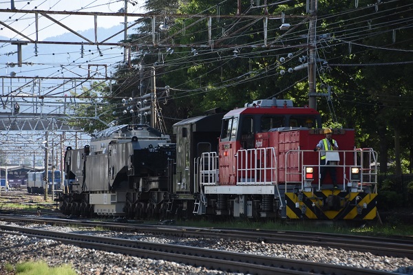 尾名高大蔵HD300-5号機が牽く特大貨物シキ801B2+ヨ8629。‘25.7.13 篠ノ井線 南松本 2025年7月13日、特大貨物シキ801B2+ヨ8629が、HD300-5号機に牽引された。■関連記事◆中央東線貨物5460列車でシキ801B2+車掌車を返却回送P:尾名高大蔵