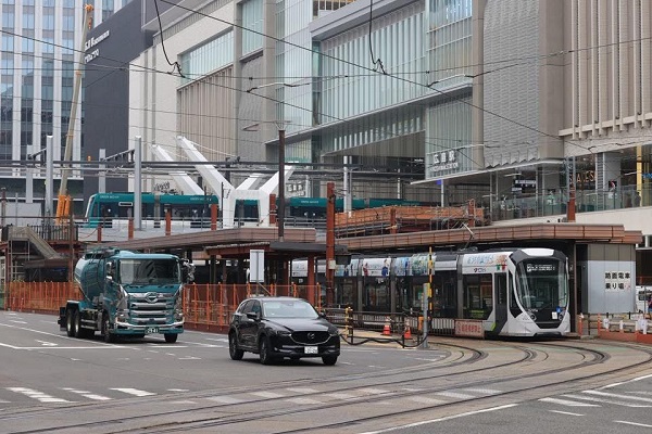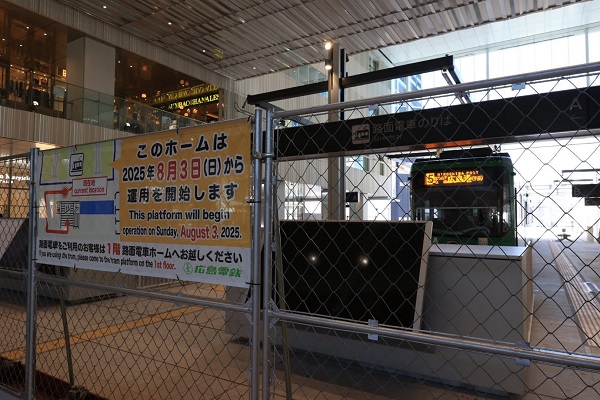 中村年秀開業お知らせステッカー。新ホームの案内表示。‘25.7.16 広島電鉄 広島駅(2点共) 広電駅前大橋線が、2025年8月3日に開通する。試運転電車の本数も増え、車体には開業マークのステッカーも貼られている。■関連記事◆広島電鉄駅前で大橋線を試運転P:中村年秀