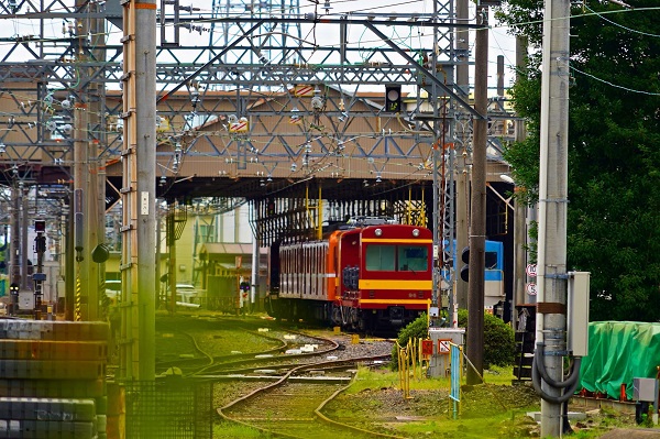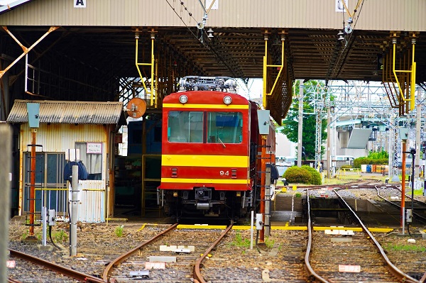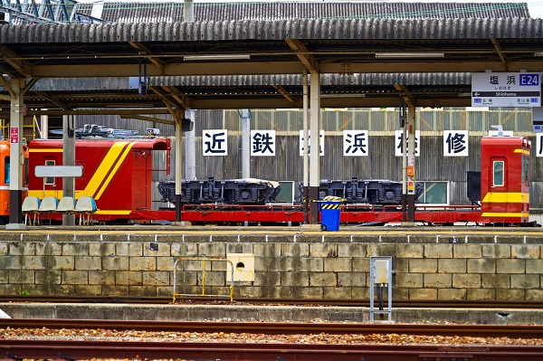 近鉄塩浜検修車庫に入庫中のモト94-96に牽引された「養老鉄道600系604編成」。同社の車両が整備・検査等の検修を実施するため、桑名駅北西の東方操車場に設置された台車交換所で台車を標準軌の仮台車に履き替え、狭軌用台車は電動貨車に積み込まれる。