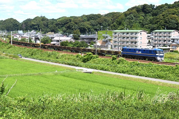 2025年7月21日、猛暑が続く中、黒崎発越中島貨物行きの60kg 150mレール28本を積載したロングレール輸送の8090列車が運転された。幡生操車場~新鶴見信号場間を、新鶴見機関区所属の最新鋭EF210-376によって牽引された。編成は、チキ5400-3、チキ5500-7、8、9、チキ5450-2、チキ5500-10、11、12、チキ5400-2の9両だった。
