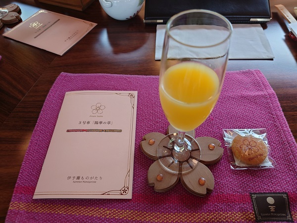 観光特急「伊予灘ものがたり」3号車「フィオーレスイート」に乗車すると、まず、ウエルカムドリンクが提供される。それは、みかん生産が国内有数の愛媛県ならではのみかんジュースなのだが、とにかく美味しいの一言につきる。これまでは、愛媛県オリジナル品種「甘平」を使ったものだったが、今回はそれとは違った味わいのものだった。なんの品種のものかを聞き逃してしまったので、また、機会をつくって3号車に乗らなければならなくなった。