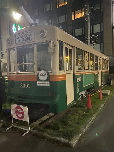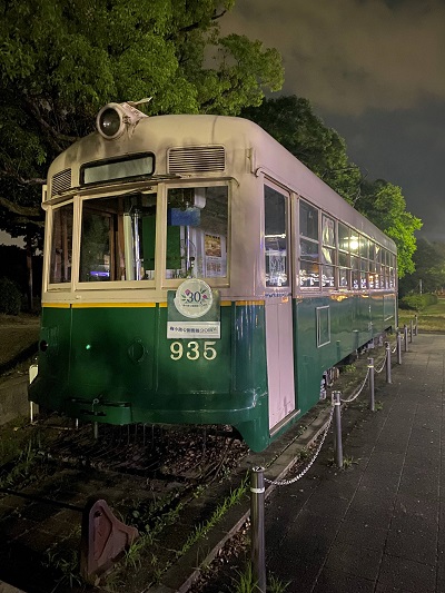 梅小路公園に保存され、案内所としても活用されている京都市電の2001号車と935号車。2025年7月31日に現地にいったところ、梅小路公園30周年の特製ヘッドマークが、系統版受けに掲出されていた。
