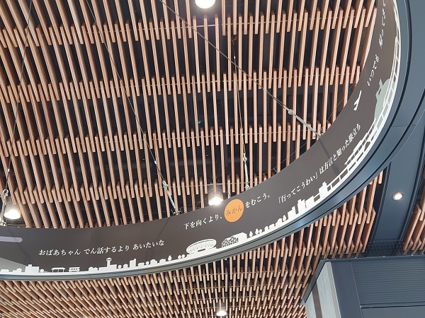 新駅舎が開業して間もなく一年を迎える松山駅で気になる看板を見つけた。「下を向くより、みかんをむこう。」ユーモラスでありながら、そっと心を励ましてくれる言葉だった。