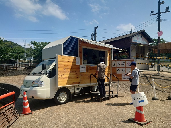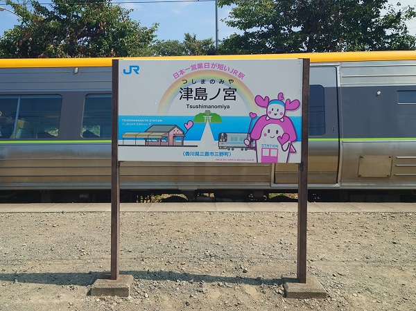 植松 繁つしまのみやえきちゃんが描かれる記念駅名標。まるでクレープ屋さんのような移動式切符売り場。‘25.8.5 予讃線 津島ノ宮(2点共) 2025年8月4・5日、津島ノ宮(津嶋神社)の夏季大祭開催日に、2日間のみ営業する津島ノ宮駅が開設された。例年、帰りの切符を求める乗客で混雑するので、移動式トラックタイプの切符売り場が出現した。■関連記事◆日本一営業日が短いJR駅「津島ノ宮駅」、今年も開設P:植松 繁