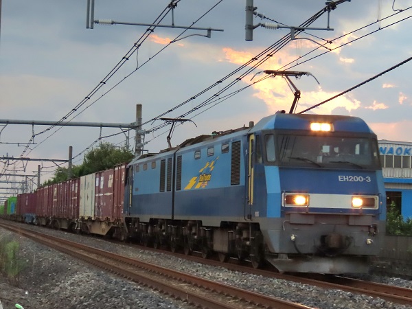 2091列車をエスコートする青雷神ことEH200-3。 DOWAエコシステム、日本製紙共同所有のU32Aコンテナ、 DOWA通運無蓋コンテナは21基連続搭載して圧巻だ。