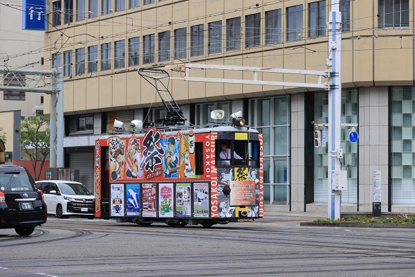 中村年秀はりまや橋を行く花電車。‘25.8.9 とさでん交通 はりまや橋 とさでん交通では、第72回よさこい祭りのPRのため、期間中の2025年8月9~11日に、貸1形を使用した「よさこい花電車」を、市内東西線とはりまや橋~桟橋間で運転した。■関連記事◆【とさでん交通】「あんぱん」ラッピング電車を運転P:中村年秀