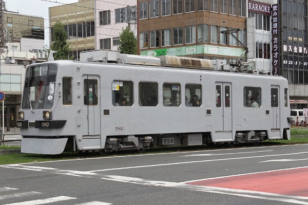 加古裕之豊橋駅前で信号停車中のモ782号。‘25.8.12 豊橋鉄道東田本線 駅前~駅前大通り 豊橋鉄道は、市内線のモ782号の外装リニューアルにともない、2025年8月9~24日の期間限定で、同車両をグレー一色で運行している。広告の契約終了により、次の広告の契約履行まで、下地の塗装を逆手にとった奇抜なアイデアだと思われる。■関連記事◆豊橋鉄道市内線の3203号が復刻デザインで運行P:加古裕之