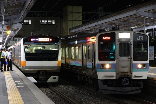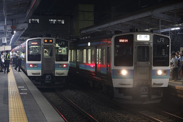 東京方面への当日中最終臨時列車である211系N319編成ほか6両による岡谷発高尾行き9452M(左)と、211系N314編成ほか6両による茅野発松本行き9561M。3両編成で種別表示が方向幕のままの編成は、千葉・房総方面で活躍していたものもある。