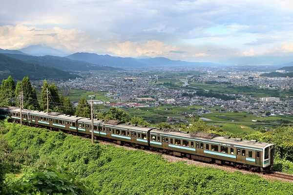 善光寺平を背に三大車窓の姨捨付近を走るN317クモハ211-1001以下。1985年製で、間もなく登場から40年経つ。普段この時間に211系の運用はなく、それも上野口211系トップナンバーだ。