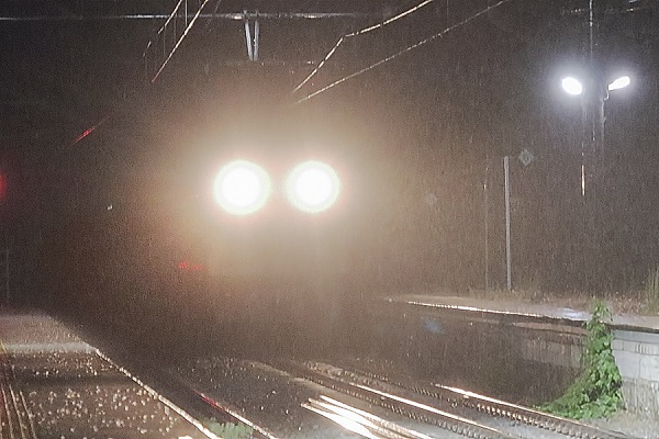 2025年3月ダイヤ改正後、愛知区EF64の運用は稲沢~南松本間となり、姨捨駅前後、約15kmの25‰登坂は長期休みに篠ノ井派出回送時だけと「鉄道投稿情報局(2025.8.22)お盆前後に貨物EF64単機が姨捨を越えて篠ノ井派出へ」で伝えた。ところが、8月25日、EH200-11が不調のため、EF64 1038が83~80列車を代走し、所定EF64時も空転対策でEH200代走もあった80列車の姨捨登坂の再来となった。喜ぶべき事態ではないが、しなの鉄道115系や所定時には姿のなかったEF64 1001号機と顔を合わせた。また、登坂後の聖高原駅では、豪雨の中、満載に近いコキ12両を牽引した。
