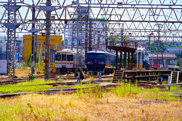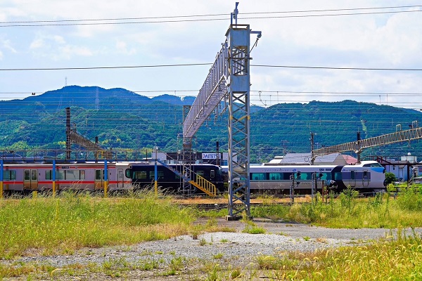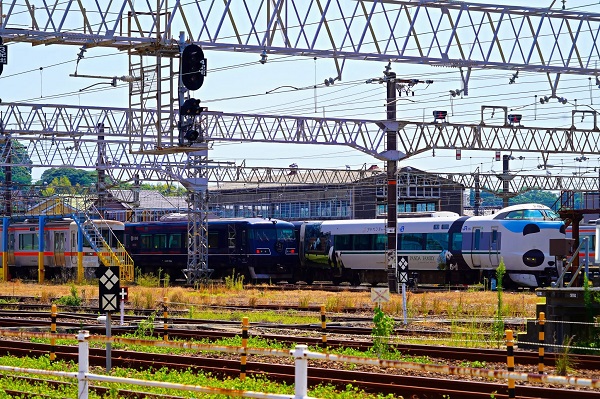 前日の朝、 新宮に到着した「銀河」が、3番のりば西側にある車庫に留置されていた。左側に、JR東海の「キハ25系気動車」、右隣りに 287系「パンダくろしお」が入庫し、並びが見られた。