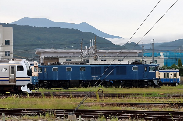 荷物室再現側を先頭に直江津に向かうET127系V8編成。長野の車両のほか、訪れていたE193系、そして背後中央上にE26系カシオペア、その左に正真正銘の荷物車マニ50 2241が見送っていた。