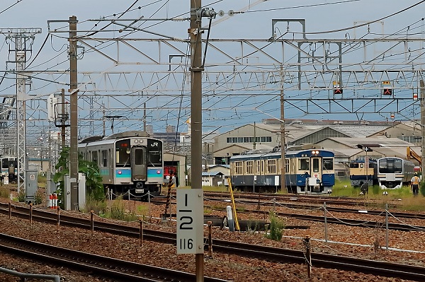 普段は出会うことがない、E127系とET127系。たまたま工場出場と入区のタイミングが重なり両者が出会った。塗装(ラッピング)の違いで印象が変わる。左端、重機の下に、解体中の115系S10編成最後の姿が見える。