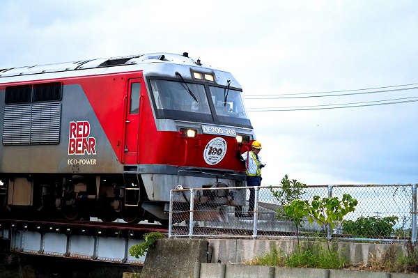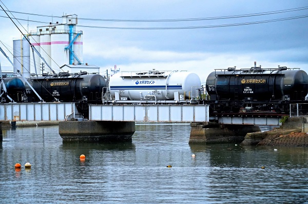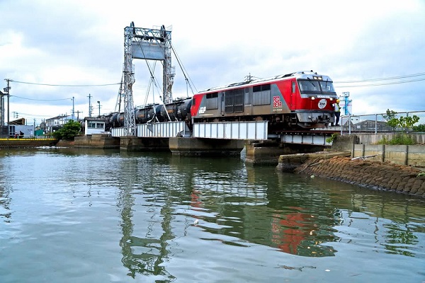 千歳運河にかかる跳開式可動橋・末広橋梁を渡るDF200形牽引のセメント貨物。先頭に立つ206号機には「JR貨物稲沢駅開業100周年」記念ヘッドマークが掲出されていた。1981年のタキ1900形以来、42年ぶりに製造された「JR貨物タキ1300形貨車」も編成に含まれて運用されていた。
