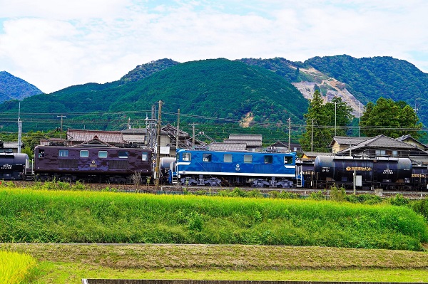 2025年9月22日、原岳の麓、東藤原駅に停車中の特別塗装ED45牽引のセメント貨物。三岐線電化70周年記念として登場時の茶色一色塗装に復元された1号機と、「三岐鉄道×秩父鉄道 電気機関車コラボ塗装」企画の一環として、秩父鉄道カラーに塗り替えられた4号機が、顔を揃えた。