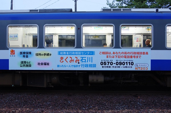 のと鉄道では、「総務省行政相談センター」のうち、石川県内を担当する「石川行政評価事務所」の行政相談窓口、「きくみみ石川」の広報ラッピング車の運行を始めた。