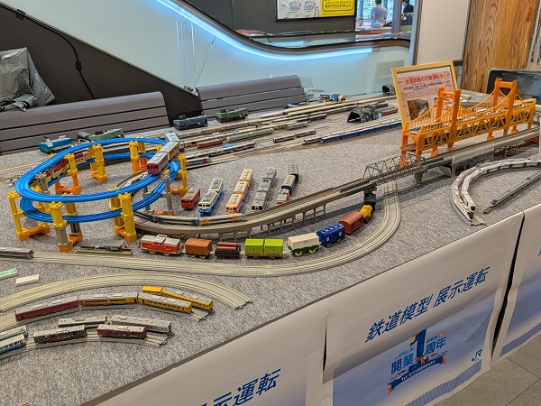 社員有志によるNゲージやプラレールの模型運転展示が行われた。