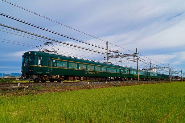 田園地帯を駆け抜け、大阪上本町駅に向かう「クラブツーリズムツアー参加者専用列車「かぎろひ」。