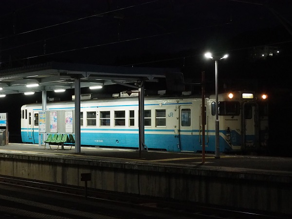 2025年10月6日早朝、予讃線鴨川駅で徳島運転所所属のキハ40 2145と遭遇した。試運転幕を表示しており、多度津工場へ入場すると思われる。