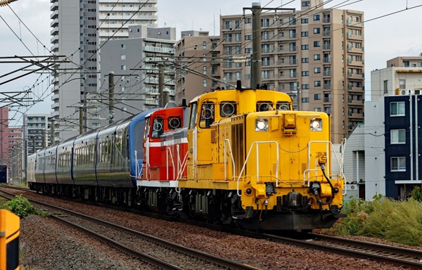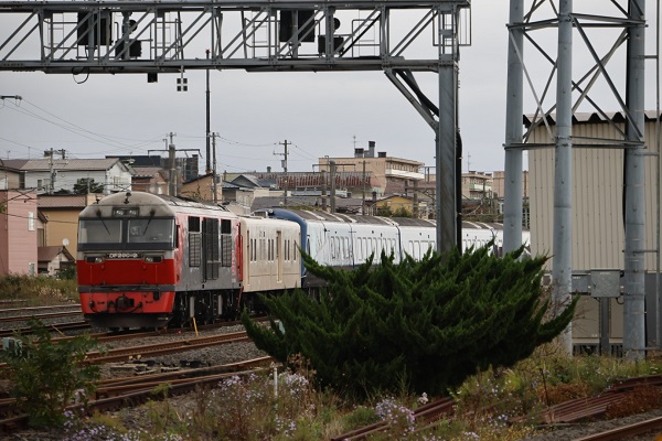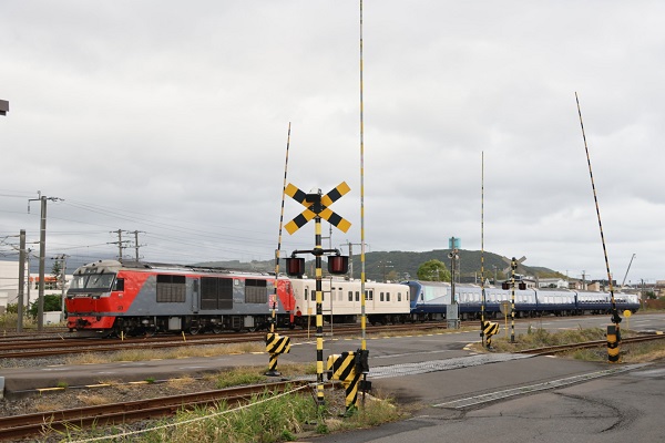 佐藤直幸回送されるTHE ROYAL EXPRESS。‘25.10.7 東室蘭操車場(2点共) 2025年10月7日、北海道クルーズを終了した「THE ROYAL EXPRESS」が、DF200-2の牽引で本州に向けて甲種輸送された。■関連記事◆「THE ROYAL EXPRESS 北海道」2025年の運行を終了P:佐々木裕治
