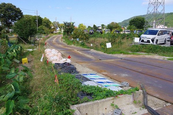 市道「鶴来金剱線」から鶴来方(七ヶ用水側)を見る。右カーブする廃線跡をなぞる様に、工事で幾枚も鉄板が敷かれていた。