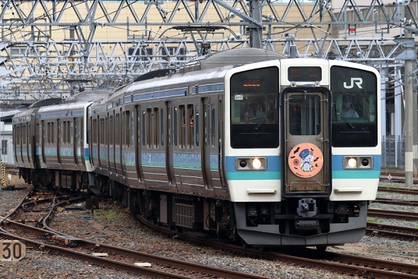 南入換線に向かう211系特別乗車体験号。2022年登場の長野駅キャラクター「ながも」のヘッドマーク付きだ。「ながも」は、かわいらしい姿で、駅では母娘に大人気だった。