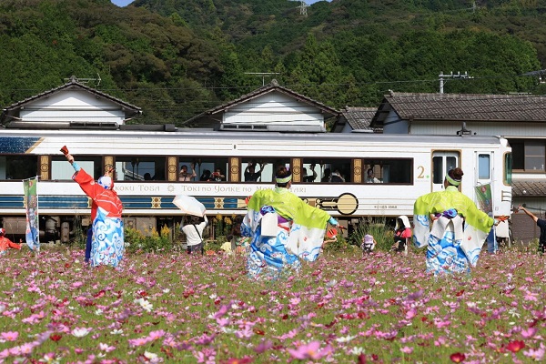 中村年秀徐行しながら通過する観光列車。‘25.10.19 土讃線 日下~岡花 2025年10月18・19日に、日髙村コスモス祭り会場ではよさこいチームと一緒に、観光列車「志国土佐 時代の夜明けの ものがたり」にお手振りを実施した。列車は会場付近を徐行しながら車内からもお手振りがあり盛り上がった。■関連記事◆【JR四国10月3連休多客期輸送】シャトル特急「いしづち24号」を国鉄色キハ185系で運転P:植松 繁