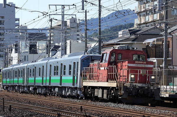 DD200-25の牽引でJR神戸線を上るHB-E220。