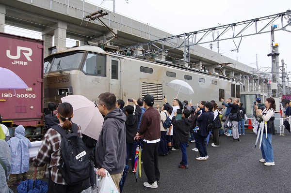 係員や荷役作業のフォークリフトが待機する南福井駅構内に入線する、EF510-509(銀)牽引の4076列車。係員の解説曰く「仕込んだわけではない」とのことで、これまでの機関車運用の流れが見学客に幸運をもたらしてくれた。